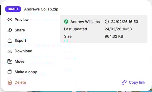 Right-click on a Draft file in Gravity Sketch Web to open its context menu. From the dropdown select Export.