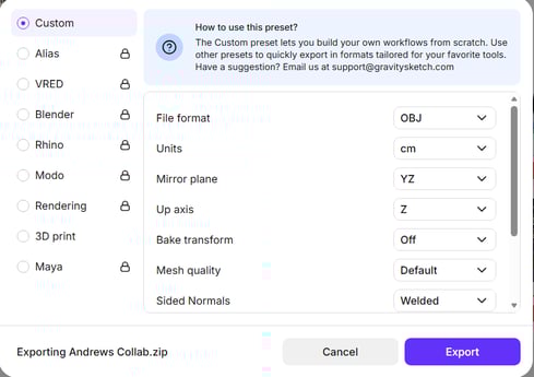 From here you can choose an export preset for your target software on the left of the menu or tweak specific settings on the right side of the menu.